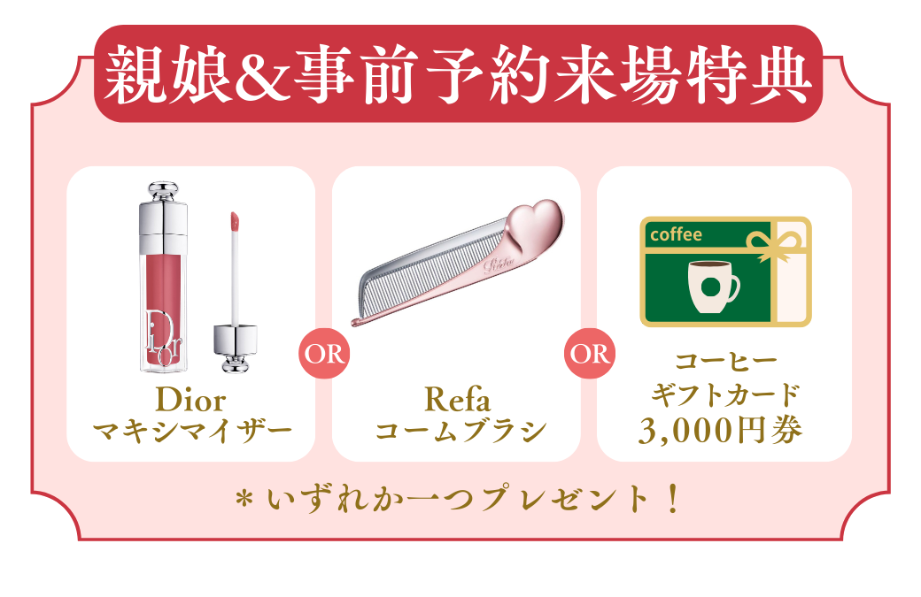 ※事前に予約フォームよりご予約の上、親娘様ご一緒にご来場いただいた方が対象となります。