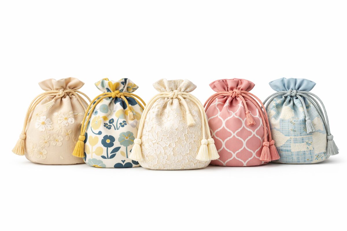 巾着バッグは可愛らしい印象があり、華やかな着物や袴のコーディネートとよく合います。最近はレース素材や刺繍入りの巾着バッグも多く、写真映えするアイテムとしても人気があります。