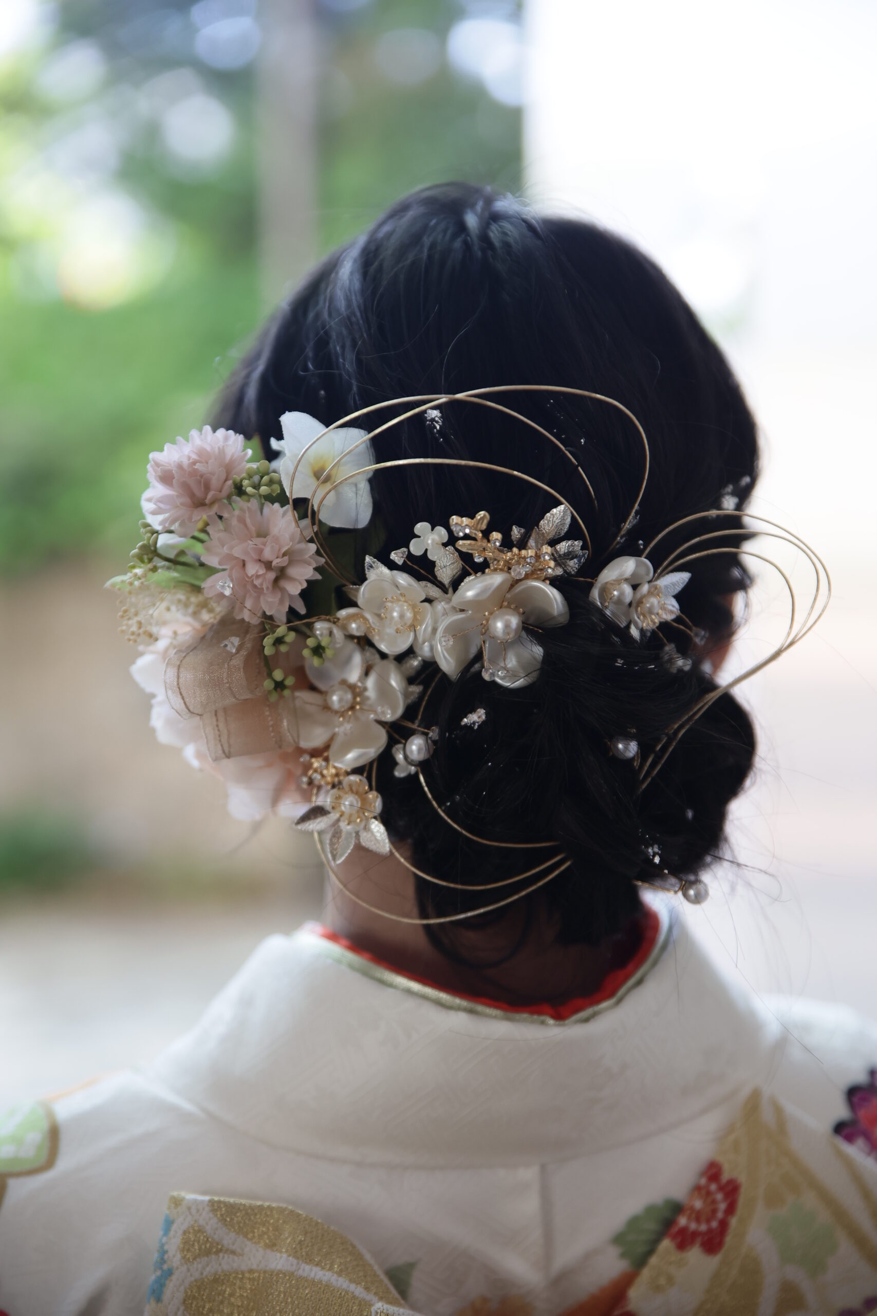 アップスタイルは写真映えしやすく、特に正面や振り返りショットで美しく見えます。華やかな髪飾りを合わせることで、より印象的な仕上がりになります。